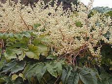 11〜12月に開花 小花は薄白茶色のボール状で径3 cm程度 集団で上向きに房状に咲く 花の全体長さは60cmに及び豪華 暖地で庭に植えられている 葉は八手より大型 葉はザラザラ感があり光沢がなく 紙状 樹高3mまでの常緑低木 用途:暖地の広い庭や荒地用