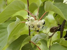 5〜6月に白い5弁の花を咲かせ径2 cm程度 オシベは黒く特徴的だ 葉の柄は長めで色が赤い 雄雌異花 両性花もある 葉はマタタビみたいに白くはなら ない 実は長さ3cm程度の楕円形で緑黄 色に熟し食べられる つる性落葉木 シナサルナシの改良種がキーウィ フルーツ 用途:庭木