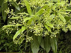 5月ごろ6弁の薄い黄緑色の小花を 集団で咲かせる 葉は長楕円で先端が尖り表面は光 沢があり光る 葉の長さ8〜20cm程度 葉の幅はタブノキより細い 実は円形で夏に黒緑色に熟す 山地に生える 幹は灰褐色で平滑 樹高15mまでの常緑高木 用途:公園樹、建築材