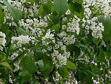 5〜6月に白い5弁の小さな花を房 状に咲かせる 山地に生える 花径1.3cm程度 実は楕円形で暗紅色から黒く熟し 食べられる樹高15mまでの落葉高木 この花はウワミズザクラより大き くて綺麗だ 本州中部以北に花の少し小さいシ ウリザクラがある 用途:街路樹、器具用