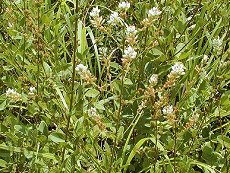 茎の先に穂状に白い花を咲かせる 8〜9月ごろ咲く 花長さ1cm程度 日当たりの良い砂地に生える 樹高1.5mまで 暑い夏に咲く 茎は直線的に伸びる 近いめどはぎ 普通の山萩
