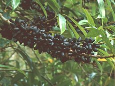 7〜8月葉脇に小さい白い花を沢山 つける 花径7mm程度 暖地の山に生える 葉は互生し長い楕円形で縁は丸く 表面は光沢がある 葉の長さ10cm程度 木肌は赤褐色 実は翌年の冬に熟し紺黒色 10mまでの落葉中木 照葉樹林の木は皆同じように思え て花や実が無いとわかりにくい 似た花や実をつける同属のくろき