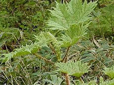 6〜7月に黄緑の穂状の花を咲かせ る 深山の日当たり地に生える 茎葉全体に鋭く長い針状の刺があ る 動物や鳥も近づけない 葉は5〜9裂し直径は20〜40cm大に なる 雄雌異株 樹高1m以下 秋に赤い実が集団で実る