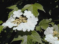 5〜6月頃に咲く すこし高地の湿気の多い谷筋に生 える 葉が丸くなく先が三つに分かれて いる 大きい葉だ 飾り花はやぶでまりより大きく2〜 3cm位になる 実は、がまずみに似ているがまず くて食べられない しかし大きめの赤い実で透明感が あり沢山なると美しい 花も実もある木だ 両方すてきだが枝が粗め 高さ4mまでの落葉低木 材は楊枝や道具の柄に利用 やぶでまり同様すこし高地の沢ぞ いに生える
