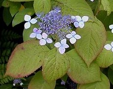 梅雨どきに虹色の微妙な色合いの 花を咲かせる 葉は楕円形で周辺が赤味を帯びる 6〜7月咲き 樹高1m位で株立ちの落葉低木 谷あいの林の縁や道そばなどにあ る 似ている花のやまあじさいは葉が 厚く光沢がある 栽培種の紫陽花 同類の小紫陽花