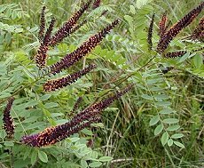 5〜6月頃造成された道沿いの日当 たりの良い斜面などに咲く 環境が良いと見違えるほど美しい 花を咲かせる 斜面の保護に導入された 花木にもなりそう 5mまでの落葉小低木 黒紫の花で粉臭がする 花柄が冬まであり特徴のある花