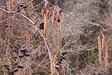 3月に葉が出ないうちに咲く 花と言うより紐状 花色はチョコレート色からオリー ブ色まで変化がある 樹全体に花を付けると美しい紐の ツリーが出来上がる 花形は白樺や夜叉五倍子(やしゃ ぶし)にも共通している 山野に一般的に育つ 別種の榛の木(はんのき)は湿地 に育つ 20mまでの落葉高木 器具や砂防用