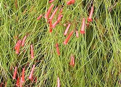 開花は周年 主に夏に開花 朱色の花で形が丁子状に長い 花長3cm程度 葉が細く枝が垂れる 樹高2m以下 日当り地で栽培 利用:鉢植え、花壇用 花言葉: