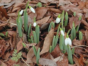 | 最近風邪になって一週間位仕事も出来なかった。 去年の夏しっかり運動してなかったので体力が落ちた なと思っており、今年は頑張ろうと思う。 人間元気で生きているのが一番だ。 ここの花壇の隅をふと見るとスノードロップの白い花 がもう咲きかけている。 ここの花園での一番の開花だ。 日本水仙と同じで球根でそれに梅雨頃には葉が枯れる。 寒い時期に育つ変わり者だが春一番に咲き可憐である。 色も真白で名の通り雪を溶かして固まった白い粒みたい。 花びらも3枚で変わっている。 |