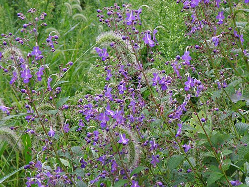 薄い水色と濃い青のツートンカラー オシベの形が面白い 8〜9月に咲く 園芸種で色も濃くなっている 薄い水色もある 葉は対生する 茎の先端に多数花をつける 花の長さ3cm程度 全草から異臭がする 日当たり地で栽培 草丈1mまで 野草のカリガネソウ 花図鑑TOPに戻る