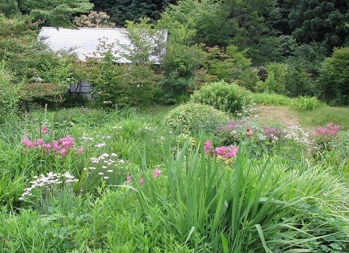 月曜日 (曇り) 生存競争 今日は梅雨前線が四国にかかって南にあり、こちらは曇り。 今は別荘地の草刈りに追われているので、今朝はまだ涼しいかなと思い近くの別荘地の草刈りに出かけた。 現地に行くと空が明るくなり青空が見えてきた。 現地は元が田で今は草原となっており、まだ草刈りが1/3程残っている。 見ると土地の中間あたりがイノシシたちによって掘り返されて穴が沢山あいている。 1部分は水路側の石も掘り返されていて水路の形が無くなっている。 まあ動物耕運機で土地の耕作をして貰ったと思い、残った奥の部分の草刈りを始めた。 少し動くだけで汗がにじみ出て来る。 1時間程草刈りをして暑いので退散した。 やはり私が普段行っている山の別荘地とは気温が大分違い暑い。 まあ夏至が過ぎて蒸し暑い時期だからやむを得ない。 体を壊しては意味が無いから。 気が向いた時に動けるのが一番楽しいかなと思った。 ここではようやく夜に源氏蛍が出始めている。 事務所に帰ってシャワーを浴びてスッキリ。 南の窓の外では今、大金鶏菊の金色の花が満開で光輝いている。 この花は強健で道路や川土手等にも野生で咲いている。 私の好きな花ではある。 花も咲き終えた花を切ってやると長々と咲いて呉れる。 他にはピンクのモナルダも満開。 濃いピンクもあるが赤色のものはもう消滅してしまった。 やはり原種系のものは強健なのであろう。 この花にはやはり蜂が蜜集めに飛んで来ている。 さすがと思った。 大金鶏菊とピンクのモナルダ ![]() 薄ピンクのモナルダ 右の緑の葉はジンジャーで夏に咲く ![]() それとここにはカリンの木が数本あり大分成長して茂みを作っている。 そこになにやら藁の葉みたいなものが絡まっているなと思い中を覗いて見た。 すると中からモズが飛び出して逃げて行った。 よく見るとモズの巣が見える。 もう卵を産んでいるのかなと思ったがそっとしておいた。 以前モズの餌のハヤニエとして燕の生々しい死体がこの木に刺してあった。 彼らにトゲのあるこのカリンの木が気に入られたのであろう。 もう住宅地化した私の事務所の周りにはいまだに燕の巣が沢山あり、いつも燕がうるさい位沢山飛び回っている。 モズは餌が豊富にあるのが嬉しいのであろうか? さすがにこの弱肉強食の自然界ではある。 我々人類も地球に増えすぎると天の神にそろそろ間引かないといけないなあと思われるのであろうか。 たしかに人口が増えすぎると土地の奪い合いを始めて戦争が起きてしまう。 なさけない人類ではある。 昨日は山の別荘地に行って道の草刈りなどをしていたが近くの林の上でギャーギャーとうるさい鳥の声がする。 私は鷹がキツツキでも捕らえたのかなと思い見に行って見た。 声は木の上のあちこちから聞こえてくる。 鷹は見えなかつた。 よく見ると嘴が黄色で体は黒に見え少し大きい。 考えてみると仏法僧かなと思った。 黒つぐみだったらもっと可愛い声である。 彼らは幼鳥の巣立ちで騒いていたのか、又仲間争いをしていたのかどちらかかなと思った。 ここの木の花は白い山法師と薄青色の山あじさいと小あじさいが咲いていた。 小紫陽花 ![]() もう林全体に緑色が深くなり花はあまり目立たない。 野草では満開のうつぼ草と咲き始めた白い鳥足升麻が目立つ位だ。 笹百合は数が多くてまだ開花中である。 道まで生えて繁殖したウツボ草 中にタツナミソウが咲いているが写ってない ![]() 鳥足升麻で咲き初め ![]() 植えた花では紫仙台萩が一本増えもせず紫のマメ科の花を咲かせていた。 よくも手入れもあまりしないのに生き残ったのが不思議である。 他には白いほたるぶくろがようやく満開。 この日は花の里で自然繁殖したギボウシとシュウカイドウの小さな苗をここの野草園に植えて来た。 帰りに花の里へ行って花を見てみるとウドンコ病で全滅したと思っていた京鹿の子の花が2割位残って咲いていた。 やはり咲くとこの花は華やかではある。 それと白いノコギリ草も咲いていて色の対比が美しい。 それと黄色のキリン草が庭の立水栓の近くで一本咲いていた。 また倉庫の東側にはツルのクレマチスがようやく紫の花を咲かせた。 ここにはクロコスミアが雑草みたいに混じりこんでうるさい。 それでこの部分のクロコスミアを全部抜いていた。 これで前に植えていた野草の風車が復活して花を咲かせてくれれば嬉しいのだが。 他には赤い八重と一重の撫子が咲いているが数量が少なくなっている。 保護してやらないとなかなか増えない。 他にはタチアオイが咲いていたが今年は程々である。 年毎に咲き方が変わる花ではある。 花の里の庭 濃いピンクが京鹿の子 白はノコギリ草 ![]() 日記前のページへ 日記次のページへ 日記の最初の目次ページへ 花図鑑ホーム |