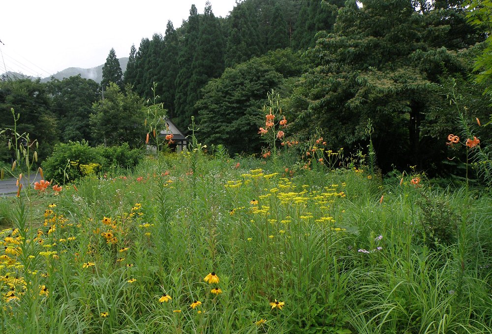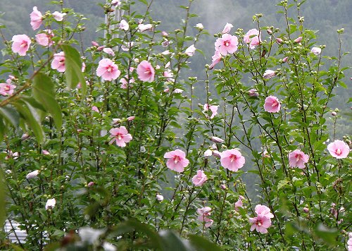 月曜日 (雨のち晴れ) 神様 今日は台風が四国方面を通過していて今朝は風が吹き雨も激しかった。 でも午後にはもう雨も止んで青空が見え始めた。 気温もわりに低くて暇も出来たのでこれ幸いとばかり花の里の別荘地の草原の草刈りに出かけた。 花の里に着くとここはまだ小雨がパラパラと降っていた。 でも少し休憩していると雨がやみ始め気温も低いので早速草刈りを始めた。 そこの草原には今オミナエシと小鬼百合とグラジオラス、ルドベッキアが盛りと咲いていてススキ等の雑草とが 一緒に茂っている。 5月には綺麗に草刈りしたのだが梅雨を過ぎた今、また雑草の草原となっているのだ。 ここの草原の中には昔私が花壇を作っていて、植えたアメリカ菊やハーブのオレガノも生き残っていて咲いている。 アメリカ菊 まるで野の花のようにやさしい咲き方 そう言えば秋の七草も大部分開花している ![]() 実は昨日も午後は山の別荘地に行き、帰りにここの花の里でこの草原の草刈りをしていたのだった。 草原の中の花を残しながら雑草だけを刈るのはなかなか気を使うし骨が折れる。 刈っていると時々小雨が舞うけど、太陽が照って暑い日よりまだ作業は今のほうが楽である。 強く降っている時は車に逃げ込み冷たいお茶を飲んで休憩していた。 なんとか草刈りを形だけ終えた頃には強く雨が降ってきて管理棟に逃げ帰った。 草刈り終了時 まだおおまかだが? ![]() 花の里の花壇は色々な花が盛りと咲いている。 その中で数本、昔に植えて貰ったムクゲのピンクの花が大木となり満開で綺麗である。 道傍のムクゲ 雨の中写したのだが風が強くてうまく写らなかった ![]() またこの暑い季節の緑ばかりの木の中で今ヤブデマリの赤い実が見事になって風情がある。 ここの新しく開花した花ではキスゲが斜面に増えて満開となった。 アブラムシがついていて殺虫剤を昨日撒いていたので花は元気。 いつも通りのんびり入浴して体力回復し、花の里の神様に今日の作業が無事済んだ事を感謝し雨の中を帰った。 帰りの気温は24度位。 町が近づくともう雨はやんで青空が見えていた。 さすが雨の多さは西中国山地だなと思った次第。 昨日は原爆の日。 朝からテレビで放送をみていたが中で感動したのは小学生の平和の誓いであつた。 若い人たちの平和への今後の活動を期待するものである。 広島市長の世界への核廃絶運動も素晴らしい。 現政府や政治家たちのあいまいな平和活動にはあきれてものも言えない。 今後、世界に誇りとなるような日本の若者たちの平和活動を期待したい。 日記前のページへ 日記次のページへ 日記の最初の目次ページへ 花図鑑ホーム |