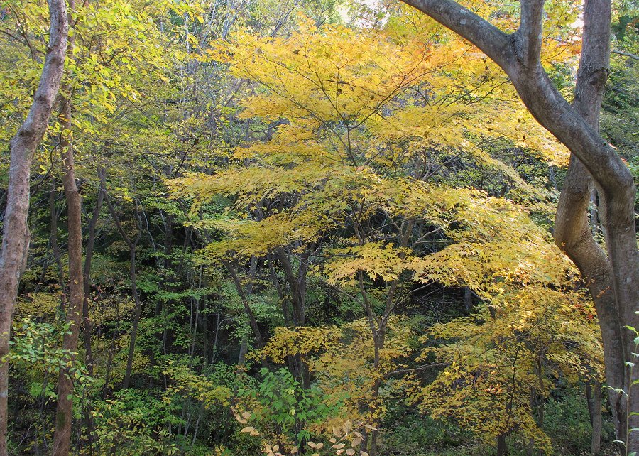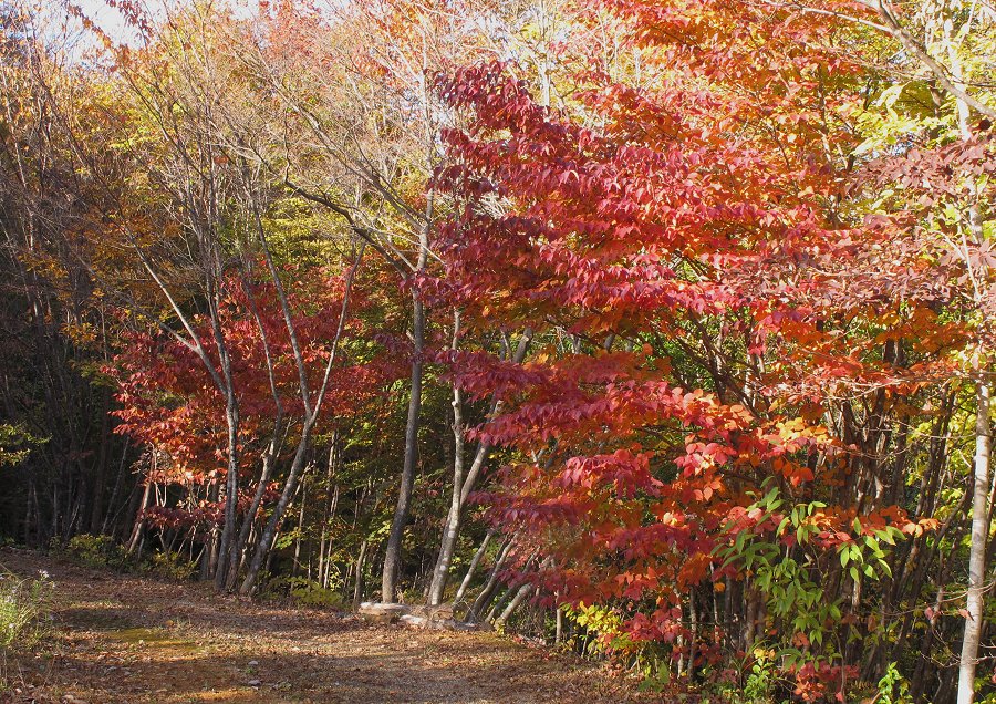 金曜日 (晴れ) 文化の日 今日は休日と連休が重なり秋の行楽に出かける人たちは多い。 10月は土日と言うと雨模様であった。 私も山の別荘地の林の紅葉具合を見ようと西中国山地に出かけた。 朝はそんなに寒くはなくて、昨日の小春日和みたいではないけれど気持ちの良い日であった。 途中の山々はそこそこに紅葉しており、赤松林ももう松茸採りは終わった感じがする。 草も枯れ気味で淋しい感じ。 山の別荘地につくとそこは紅葉の盛りであった。 なんでもないコナラや水楢の木まで紅葉している。 スキー場もいよいよ冬の到来を待って、もうコースの整備を始めていた。 前回に行った時には山の紅葉が黄色と言ったが、今日は全体がもうオレンジ色で中に紅葉した木々も沢山混じり綺麗である。 下の灌木には常緑のアセビやソヨゴ、深山シキミの濃い緑も混じって総天然色。 深山シキミの枝先にはもう真っ赤な実が沢山なっている。 澄みきった青い空には白い巻積雲も浮かんで西南から北東方面に流れている。 前回来た時はまるで緑色だったモミジたちも今日はすっかり赤や朱色、黄金色となって色づいている。 台風通過後の低温がそうしたのだろう。 あまりの変化にびっくり。 ![]() 今年の紅葉はトップクラスではないかなと思う。 動画で山の中間部 動画で山の上部(ブナ等大木が多い) 山法師の紅葉 ![]() 小羽団扇楓の黄葉 ![]() 時折、風が吹くと落ち葉がサラサラと空から舞って道に落ちて来る。 アスファルトの道は落ち葉とドングリの実で一杯になり茶色と化している。 車で走るとバリバリと音がするのだ。 草が生えた場所ではミヤマホオジロ等の小鳥の集団が草の実を食べていたりする。 林の中では中くらいの鳥やコガラ、ヤマガラ等の小鳥も結構飛び回っていたりする。 そのうち山が落葉すると彼らは餌を求めて暖かい南の山に移動するだろうけど。 私は紅葉を楽しみながら林の中の不要な枝や細い木等を整理していた。 今年はかなりこの作業をしたので全体の林の中が明るくなり又歩きやすくなっている。 これで林の中にも野草の花が咲き始めると嬉しいのであるが。 年を重ねて積もった落ち葉が厚いので簡単には生えないであろうが。 昨日は海辺に行って見ようと周防大島に出かけた。 もう海岸部も秋模様ではある。 棚田では稲刈りはすっかり済んで法面も綺麗に刈り取られて冬を迎える準備も済んでいる。 ![]() 周防大島では早生の蜜柑があちこちで販売されている。 美味しくなったのであろう。 私の整備している別荘地でも木の下のツワブキの集団が、緑の草の中で黄色の花を咲かせて綺麗。 野路菊も白い花を咲かせている。 ここでは木の間に生えた草刈りと落ちた枝や枯れた草等を燃やす作業をしていた。 ここは常緑樹が大部分なのでまだ暖かい感じである。 東には海も見えて遠くの島もライトグリーンに彩られなかなか爽やか。 国道と東の瀬戸内海 ![]() 夏は暑すぎるけど冬は温暖でのんびりする。 冬は美味しいフグ料理もいただけるので楽しみではある。 寒くなると私はこちらでまた小山などの整備を始める事となるのだ。 日記前のページへ 日記次のページへ 日記の最初の目次ページへ 花図鑑ホーム |