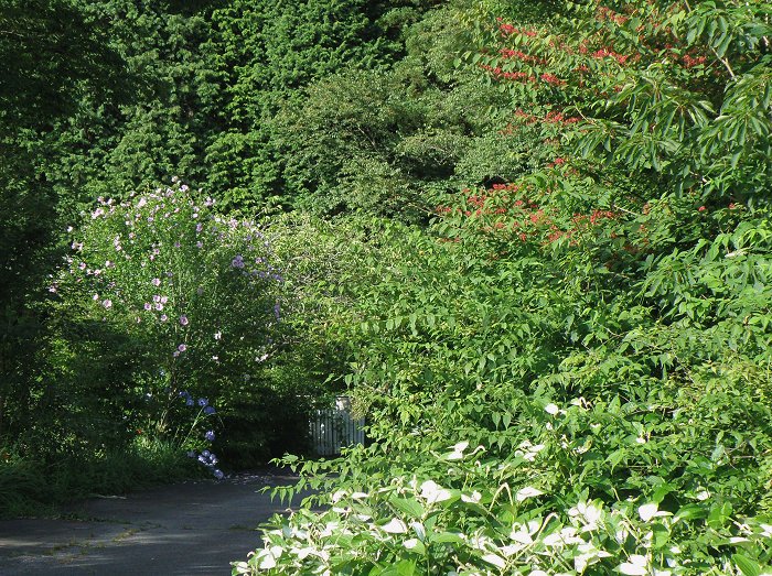 日曜日 (晴れ) 自然と私 昨日今日と仕事が入らないのでのんびりと山の別荘地に行っている。 今朝もムシムシと暑くて事務所にはいたくないである。 事務所の庭では日日草が一本生き残って派手に咲いており又ガウラの白い花がある位。 朝のTVも面白くないので早速に山の別荘地へ出かけた。 空を見上げると青い空に真っ白な雲が湧き出て直視出来ない位に輝いている。 10時半なのにもう太陽は真上である。 車のクーラーを頼りに走って行く。 今年は外に出ていて暑いと車の中に逃げ込み、クーラーで涼むのが普通となっている。 それで何とか外の作業が出来るのである。 行く道ではもうネムの木も花が少なくなっているがリョウブの白い花が盛りで目立つ。 それと道ではサイクリングの若い人たちが沢山走っている。 この暑い道を元気に走っていて感心する。 さすがに若さではある。 山の別荘地の林の中では気温が27度でそんなに暑くはない。 ここと町では6度位、温度差があるのである。 でも体を動かすと汗が顔からにじんで出てくるのでタオルは必携である。 それと舗装道路周りではアブの群れが飛んで来たりする。 飛んで来ると用意しているハエ叩きで退治しているのだ。 今日は道の枯れ葉や落ちた枯れ枝をブロワーで吹き飛ばしていた。 汗をかくと渓流の中に降りて水の中の枯れ枝等を取り除き、中の小石等を整理していた。 ここではたまに糸トンボやオニヤンマ類が飛んで来る。 それと渓流の中には小さい赤カニもいる。 流れる水が冷たくて、ここはアブが来ないので楽である。 木の下をふと見ると葉が2枚ありそれから長い花茎を出して白い花が沢山咲いている。 それは蘭科の連れ鷺草であった。 すごく地味である。 だから人に取られないで生き残っているのかも。 それと地面に茂った緑の葉の中で小葉の冬苺の小さな赤い実が沢山あり目立つ。 それはあまりに小さくて食べる気にもならないが見ていて美しい。 野鳥はカッコウと鶯が鳴いている位で淋しくなっている。 時々セミの日暮しの声が林の奥からする位である。 今日は蚊があまり来ない。 涼風が吹いているからであろうか? それともトンボが蚊を食べて呉れているのでは? ここの山ではカラス山椒の薄緑の花がリョウブの花と共に目立つ位で一面の緑だ。 適当に作業を済まして花の里に帰った。 ここでは花壇で夏の草花たちが色々と賑やかに華々しく咲いている。 草原ではオミナエシが黄色の花を一面に咲かせている。 それに野草化したグラジオラスのオレンジの花が沢山咲いている。 またアメリカ菊の青い花も集団で咲き出している。 小鬼百合は長い茎を伸ばして今は蕾である。 大反魂草(オオハンゴンソウ)も野原の奥の隅で群れて咲き始めている。 木の花ではムクゲが茂って花をつけ満開。 まだ紫陽花(アジサイ)も咲いているし、藪手毬も真っ赤な実を沢山ならせている。 それと臭木(クサギ)の花も咲き出した。 蝶の集まる紫のブットレアも咲き始めている。 花の里は今が花の見頃でさすがにここは高原であるのだ。 門の入り口を見返す もう花の里も庭木が育ち森みたい ウグイスや日暮しも庭木の中から声が聞こえる状態になってしまった ![]() 日記前のページへ 日記次のページへ 日記の最初の目次ページへ 花図鑑ホーム |