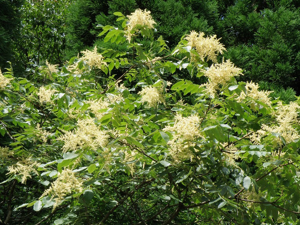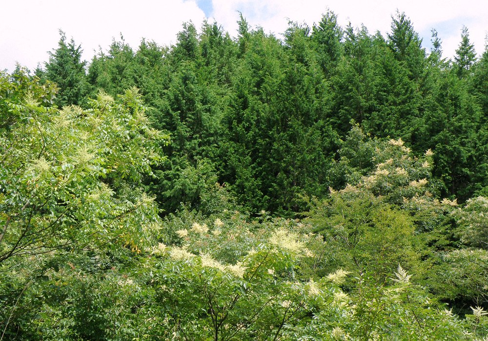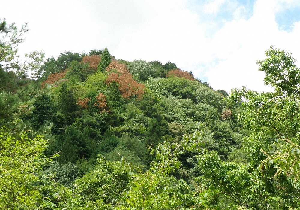 日曜日 (晴れ) 夏の紅葉 今日も朝から晴れて暑い。 空を見ると青く澄み南風が吹いて白い雲がゆっくりと流れている。 8月も最後の日曜日だ。 この所、山の別荘地の野草園付近を整備しているので今日ものんびり朝食を取りそれから向かった。 今日は少し遠回りして久しぶりに天上山林道を走ってみようと思った。 この林道は他の手入れされない林道とは違いちゃんと手入れされているのだ。 途中山登りの車であろうか一台、登山口に駐車されていた。 数日前に台風が通った影響でようやくに雨が降り、この辺り(山の別荘地も)は緑が見事に輝いている。 なかなか美しい。 この道は天上山の南側を通過していて標高は800m近い高さである。 尾根付近を走っているので周りの山々が展望出来て気持ちも良い。 近くの山の尾根を見ると中にこの夏の暑さと乾燥で枯れたのか、はたまたもう紅葉したのか茶色になった 広葉樹が沢山見える。 こんな現象はいつも走っている道の山の尾根でも見ていて赤松が枯れたのかと思っていたのだ。 良く見ると広葉樹の紅葉であった。 8月の紅葉と緑の対比 珍しい ![]() このあたりでは山時雨(やましぐれ)の赤い実が見られる。 普通の山ではなかなか見られない灌木である。 なかなか枝の上を飾る赤い実が素敵だ。 ここから尾根道を少し走ると部分的に平らな所へ出るが、この荒れ地部分にぬるで(白膠木)が茂り 薄クリーム色の花を沢山を咲かせている。 今年の異常な天候にも耐えて賑やかに花を咲かせている。 さすがに荒れ地に生える木ではある。 ![]() この木は雄雌異木で雄の木が薄クリーム色の花、雌の種が出来る木は花が赤っぽい。 写真の中央の奥に雌の木が見られた。 見事な雄の木の花(触れると人がかぶれる木の花とは思えない美しさ) ![]() この林道の中央部分に着くと西南が開けて見通しが良い。 西中国山地のはてしない山並みが見られる。 またここからでは山里の家並みもまったく見られない。 そんな自然一杯の林道なのである。 山また山の西中国山地を展望 ![]() 道を下ると谷底に着き、そこに自治体の運営するリゾート施設があってキャンプの人たちで賑わっていた。 夏休みの最後の日曜日らしい。 ここからまた道をさか登り、少し下ると私の行く花の里に着いた。 昼食を取りそれから目的の山の別荘地に着いたのだった。 天上山の詳細を見る 日記前のページへ 日記次のページへ 日記の最初の目次ページへ 花図鑑ホーム |