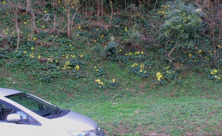 土曜日 (晴れ) 島の一日 朝起きると外はなにか暗い感じ。 空を見ると曇っている。 天気予報を見てみると広島は午前中曇りで午後は晴れるそうだ。 山口県はと見ると一日晴れの予報。 それではと周防大島の別荘地に行ってみようと思った。 橋の通行制限があるがまあ時間をかければ渡れるよと軽く考え、のんびり支度をして向かった。 山陽道は結構車が走っている。 沿岸部は紅葉の最中なので人出は多いのであろう。 山口県に入ると空は晴れてきてなかなか気分も良い。 途中の山の紅葉はと見るとそんなに盛り上がってはいない。 黄色の広葉樹がパラパラと緑の山にある位。 田んぼの稲は綺麗に刈り取られていてもう冬の準備が出来ている。 その中に早く刈り取られた早生の田には稲のヒコバエがあり、もう全体が黄色になって実も出来た感じである。 野鳥たちは喜ぶのだろうなと思った。 岩国の名産であるレンコン田も綺麗に掘り取られていて泥一面の平面田である。 そんな風景を見ながら大島大橋に着くと渡る車は少なくて1回の信号待ちでスムーズに渡れたのである。 橋の下や橋の中央部の片側では修理の工事が行われていた。 そんな事なので片側通行。 2トン以上の福祉の車が前に渡ったのであるがその時には連続して渡れず、その一台が渡り終えてから 2トン未満の軽量な普通の車が適当な車間距離をあけて連続して渡ったのである。 今日は販売を依頼された民家があり、先に少し草刈りをしようとそれから島の南側に回ったのである。 その道は島の中央の山の尾根を通過するので南側に回ると、そこは海が広々と見えて美しい風景である。 寒くもなく暑くもなく快適なので車を止めて休憩し、少し早い昼食を取ったのである。 その最中、岩国基地の大きな米軍機が島の南をぐるりと回り飛び去った。 私は兵士たちはこんな風景を見ながら飛んでいて気持ちが良いのであろうなと思った。 そのあと今度は一羽のトビが頭の上をゆるりと輪をかきながら下の田園のほうに飛び去ったのである。 トビもこんな景色の中を自由にゆるやかに飛べて幸せなやつだなと思ったのである。 私もトビになってゆるりと飛んでみたいなと思った。 ここの笛吹峠のグーグル位置図 大島から南を見る 海そばに県道があり民家がある 漁業の港が多い 沖には平郡島 四国の佐多岬はかすんで見えない ![]() 後日の望遠画像 周防灘の先の長い陸地が国東半島 真ん中にある峰が三つの山は由布岳 左に雲が横に棚引いた山が久住連山 上の画像の平郡島はこの画像では左側で写っていない 真ん中の島は宇和島と言うようだ 国東半島の両子山が右の山か? ![]() 食事を済ませてそれから急な坂を下り、海に出て少し東に行き、狭い道を登るとその民家に着いたのである。 そこは南向きで海が見えるのである。 北の上部はすぐ山で、その民家は暖かくて住みやすそう。 周りは蜜柑畠が多くて買い物には車で走らないといけない感じ。 この辺りは農協の移動店舗の車が来るのであるが詳細は私にはわからない。 ここの草刈りを汗を出しながら1時間半ばかりしたのである。 体が草臥れた所でそれではといつもの手入れしている別荘地に向かった。 今日は南から来たのでその別荘地の南側の道の落ち葉を集めて掃除していた。 それから残った小さなゴミや落ち葉をいつものようにブロワーで吹き飛ばし綺麗にした。 もうここの白粉花たちは少ししか咲いていない。 でもここは暖かいので緑一杯である。 それとツワブキの黄色の花が道端に咲いていて美しい。 さて今日の目的である東と北側のツワブキはいかがかと、回ると見事に沢山咲いていたのである。 中に白い野路菊も混じって咲いている。 それと八手の白い花も満開。 林の木の緑と地面の切り取った草の新芽が柔らかな緑で美しい。 紅葉はまるで関係ない暖地の島の初冬ではあったのだ。 ここでも少し海側の草刈りをしてしっかり運動した一日であった。 少し暗かったのでうまく写せなかったが雰囲気は感じて貰えるかな ![]() そうそう、もう二十日位になったのであろうか? 早生のミカンのまだ青い実をこちらで貰って保存していたらようやく甘酸っぱい美味しい味になったのである。 それを原産地であるこちらで美味しくいただいたのだ。 捨てるような物でもそれなりの価値はあったのだ。 ついでに数日前に行った防府市にある毛利邸の庭園の秋 広い庭園である 秋の行楽客で賑わっていた ![]() 春の画像 小葉の三葉つつじが咲いている 防府を見る ![]() 日記前のページへ 日記次のページへ 日記の最初の目次ページへ 花図鑑ホーム |