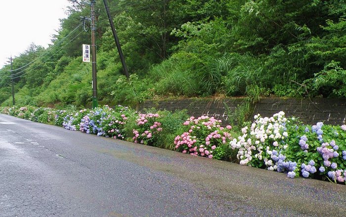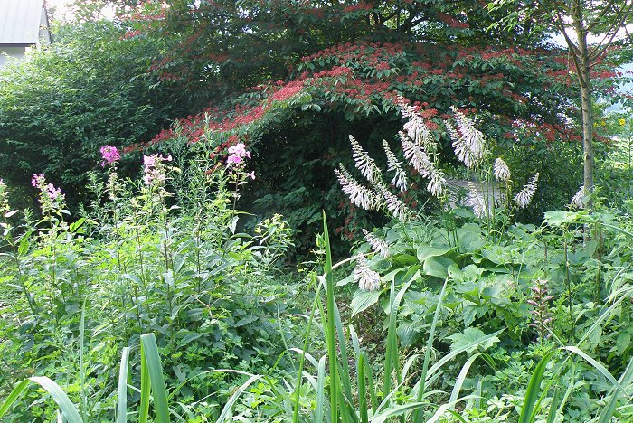 金曜日 (晴れ) 梅雨明け 今日は昨日に続き暑い。 梅雨の停滞前線はもう東北方面にあり消滅寸前。 もうここの庭ではオシロイバナの赤や黄の花が咲いている。 外で体を動かすと汗が吹き出る蒸し暑さである。 昨日は暑さから逃げ出そうと午後は山の別荘地に行って道や林の整備をしていた。 さすがにここは気温が25度で麓から涼風が柔らかく噴き上げて来る。 木の下の太陽が当たらない所で茂みの中の間延びした新芽や不要な木を切って 見通しを良くしていた。 このあたりでは小葉の三葉躑躅の木がメインなので花の群落が咲くように整備した。 今しっかり肥料でも与えると花芽が出来て来春は花で満ちるであろうと思うのだが 今日は持って来ていない。 燐酸やカリ分の多い肥料が良いとは思うのだが。 窒素分は落ち葉が地面に一杯であまり施肥の心配はいらない。 そう言えば林の中で色々なキノコが地面から沢山生えている。 油シメジみたいなキノコが沢山あったのだが少し形が違うので別種かなと思い 採取しなかった。 赤や灰色のキノコも多い。 昨年の猛暑でキノコ類はまるで生えなかったのでその反動であろうかと思ったのだ。 気温は25度なのだがやはり体を動かすと汗が吹き出る。 適当に動いたとこで作業を終わり花の里に戻った。 こちらは花壇や草原には夏の花が沢山咲いて賑やか。 草花では角トラノオやオイランソウ、グラジオラス、オミナエシが咲き出して来た。 それと今、ギボウシの青白い花が満開で見事。 バックの赤い実は藪手毬 ![]() 雨が多いのが幸いしたのであろうが他の花たちは少し太陽光不足で花色が薄い。 他には紫のブッドレアの花やクロコスミアも咲き始めた。 クサギの木の花も咲いたのであるがやはり花色が白くてなにか冴えない。 やはり植物には太陽光だけは適当に降ってくれないといけないのである。 まあこれから太陽は多すぎる位に射してくれるだろうと思う。 夏はやはり海と高原(高地)が楽しく過ごせる場所なのではある。 いよいよ夏本番で今年もしっかり夏を楽しもうと思っている。 来月の8月8日には暦の上ではもう立秋であるのだ。 それと花の里のアジサイの花も元気にまだ咲いている。 ここでは今まで雪が多くて紫陽花の枝が折れたりして以前は良い花が咲かなかった のであるが今は積雪が少ないので綺麗に咲くのだ。 ![]() 数日前、安芸太田町の深入山横のアジサイ道路を走ったのであるが見事な開花 であった。 手入れ次第で、ここは日本一のアジサイ鑑賞の場所になりそうである。 ![]() もう一つ、気になった事は葛(くず)の花がまるで咲かない事である。 葉などはしっかり茂っていて蔓も沢山出ているのだが。 これもやはり太陽光不足の結果かなと思う。 葛は根から葛湯や葛根湯(かっこんとう)が取れて有用な植物である。 私は風邪などに葛根湯をいつも利用していて、お世話になっている植物なのである。 一度根を掘って乾燥し薬用に飲んでみたいと思っているのだが・・・・ またマタタビも実が大きくなっている。 これももうすぐ収穫でマタタビ酒が作れるのだ。 マタタビ酒は元気回復に利用するのである。 日記前のページへ 日記次のページへ 日記の最初の目次ページへ 花図鑑ホーム |