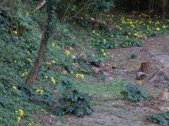 月曜日 (晴れ) 秋の自然の中で 今日は早朝に雨が降っていた。 久しぶりの雨である。 でも朝にはもう晴れていて中々気分の良い秋の日であった。 今日は久しぶりに呉の西南にある江田島の民家の周りの清掃に行っていた。 南風が強い日で気温も20度で動くと暑い感じであった。 台風の後始末と猪が荒らした畠の草刈りもした。 帰りには音戸の瀬戸の日帰り温泉で海を見ながら入浴した。 そんな一日。 昨日は日曜日であるが高速の割引もあり、周防大島の丘の別荘地に出かけた。 なぜかと言うと先週にそこの丘を草刈りしてたのだが高野帚(こうやぼうき)の花が見事に咲いていた。 それは草丈が40cm位だが中心がピンク色で回りは白い2cmばかりの花が集団で咲いたのだ。 今までこんなコウヤボウキの開花を見た事がなかったのである。 その日は忙しさに紛れてつい写真を写せなかったのだ。 また後日でも写せば良いなと思った。 他にはツワブキも集団で咲いていてこれも綺麗であった。 そんな事で昨日は早めに出かけたのである。 現地に着くとツワブキが南側には少しであったが東と北側は見事に緑の葉の上に黄金の花を集団で咲かせていた。 それで調子よく丘の上のコウヤボウキを写しに上がるとその日は長い乾燥でか、花が小さめになってぱっとしない。 やはりこの花の輝く時はわずかの時間であったのだ。 一応今の開花の写真を写したのであったが残念。 後日に写した周防大島の別荘現地のツワブキ 木の切り株は杉を切ったもの ![]() この日は国道や町道周りの草刈りや清掃をしてから丘の上部の奥の部分の草刈りをした。 そこは主にゼンマイとムベが雑草(雑木)化して沢山生えており、それを綺麗に刈っていた。 中に野路菊の白い集団があり、それは残しておいた。 ここは休憩時には青い海が木の間から見えて美しい。 それと太陽の光も木々の間からもれて当たり丁度良いのである。 私は出城の城主気分でのんびり秋を楽しんでいた。 こんな時ムベやアケビの実を食べられると良いかなとは思った。 ここには犬枇杷(いぬびわ)の木が沢山あって食べられるかなと思い、切らずに残しておいたのだが それに1.5cm位の黒い丸い実が沢山なっていて食べると美味しかったのである。 これは乾燥した日が続いたからか特に甘くなっていたのである。 子供の昔にかえり沢山食べた。 それと地面には冬苺も小さい赤い実を沢山つけていたがこれは酸っぱかった。 これはまるで小鳥の気分で食べていた。 そう言えば今、ウグイスの地鳴きが周りから聞こえて来る。 あとはヒヨドリの鳴き声位。 この島では帰りに潮風呂保養館の日帰り温泉に入ったのである。 この塩湯は皮膚に良くて気持ちよく入ったのである。 一昨日は山の別荘地で林の中の整備をしていた。 その日は暖かく気温は20度もあったのだが。 こちらの朝はもう気温は零度近くになるようで、霜も降り、スキー場は人工雪のコースを整備し始めている。 そんな事で山の木たちは見事に紅葉した。 やはり暑さが長くて急に温度が下がると紅葉は反応するようである。 もう谷のモミジも真っ赤やオレンジ色になっており、葉が散れば秋も終わりである。 水楢の枯れ木にムキタケが生えていたが、大きさが例年の1/3の大きさ。 それでまだ食べる気にもならないのだ。 ここでも帰りは花の里で入浴。 ここはラドン湯なので元気回復には良い。 秋は野外での労働と温泉入浴の自然を楽しむ生活であった。 山の別荘地で下の道の奥部分 ![]() 立ち枯れたミズナラの幹に生えたムキタケ 水不足で小さい ![]() 日記前のページへ 日記次のページへ 日記の最初の目次ページへ 花図鑑ホーム |