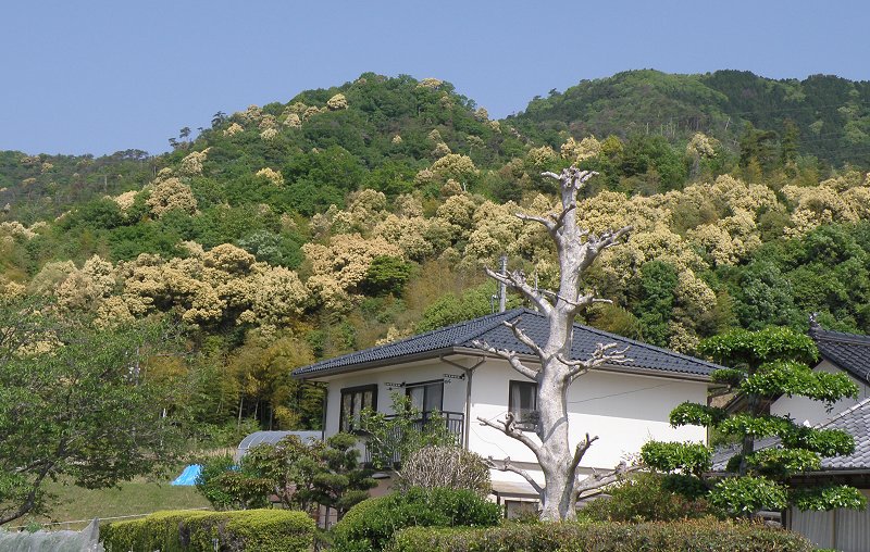 木曜日 (晴れ) 異常気象 今日も晴れている。 いつものように朝は食事を済ますと早速ホームセンター(建材店)に行きバラス(小砕石)を買って 吉和の山の別荘地に行った。 今の林は若葉が出ていて爽やかである。 昨日は少し冷たい風が吹いたのであるが、今日は丁度良い温度で楽であった。 着くと早速、バラスを砂利道の荒れた場所に入れて走りやすくした。 これは一袋18kgもあるのでいつも三袋買って道に撒いているのだ。 それが済むと林の整備をしている。 枯れ木を除き目線をさえぎる若芽等を切って除くのである。 こうすると林の中が見通せて、なかなかここも風情がある。 今ここでは野草が色々と咲き始めた。 旧の野草園では小岩鏡がピンクの可愛い花を咲かせた。 それと白い花の鈴振り錨草も花穂を伸ばして沢山花をつけた。 去年は地面に筆リンドウがすごい数の花を咲かせたのであるが、何か動物にたべられたのか奇麗に 無くなっていて、今年はダメかなとおもったのであるがそれがなんとか小さな花を咲かせて呉れた。 ほんと地面から小さな葉と一輪の小さな青い花を咲かせていて可愛い。 他にはキラン草の青い花も見事。 又錦衣も同じ感じで白っぽい花を咲かせている。 野草園では今鈴蘭が花盛り。 草丈は10cm位であろうか、それが40本位に増えて花を咲かせた。 やはり畠と違い原野に植えている感じがするのである。 それと山芍薬の白い花も一輪咲いている。 他には羅生門葛の花があちこち繁殖して地面に花を咲かせた。 今年はこの花がここの主役。 それから道べりにはシャガが繁殖し薄青白色の花を沢山咲かせた。 ここの山にはヤマドリや兎や猪、穴熊もいるのでいつ花が襲われるか不安であるが、今はギボウシの 新芽が食べられている位。 そんなに被害は感じられなくて安心なのだ。 花の里は今年ピンクの桜のほか梨や花桃、山吹、もくれん等木の花が盛大に咲いた。 もうここは造成して30年が経過した。 で里山並みに今年は見事に木々が花咲き、これも異常気象のせいかなと思えるのである。 ここでは冬の強い低温で宿根草の半分位が枯れて消滅してしまった。 主なものはシャスターデージやフランス菊等外国系のものである。 残念であるがこの変化する自然には勝てない。 その点、野鳥のキジはこの変化にも対応して生き残り春は賑やかに鳴く。 さすがに日本の地に対応した野鳥だと思う。 今年の春、私の事務所がある周りの暖地系の常緑樹の森ではスダジイ(しいのき)たちが見事に 薄黄白色の花を咲かせた。 私が事務所をこちらの山際に移動して20年以上経過したが、今年のスダジイの見事な木の花には ビックリ。 やはり温暖化による異常気象の影響なのであろう。 人が長く石炭や石油に依存して生きてきた結果の現象である。 早めに努力して昔の人たちが暮らしてきた気象をなんとか取り戻したいと思うのである。 森林や原野などの保護に頑張ろう。 里山に咲いたスダジイの木の花(薄黄白色) ![]() 日記前のページへ 日記次のページへ 日記の最初の目次ページへ 花図鑑ホーム |