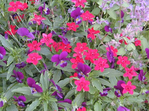 紫の花はパンジー、右上はキャットミント