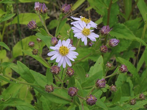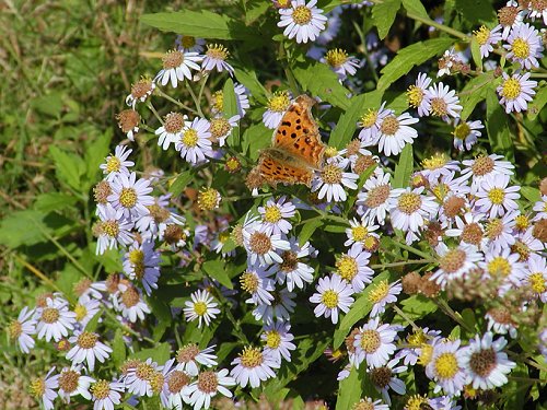 秋咲き 9〜11月開花 涼しくなると咲いてくる 秋らしい花だ 明るい道端や土手に生える 嫁菜の花の後に咲く 花色は薄い青色 花型は小菊状 花弁の細いものもある 葉は嫁菜に似ていて細長く鋸歯がある 栽培種の紺菊 草丈60cm程度 集団を作る 大画像 蝶はキタテハ 実物大の画像 戻る 花図鑑TOPに戻る