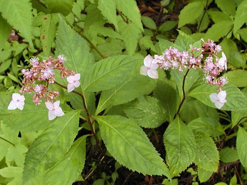 8〜9月咲き 半日陰の林縁に生える 葉が互生している かわいい紫陽花といった風情 花はやわらかいピンク色で、かなり色幅がある 草丈50cmまで 秋に葉が濃い赤に紅葉する 群生すると美しい 戻る 花図鑑TOPに戻る