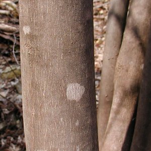灰色で表面は滑らかで、小さく白い縦割れもある。白い斑点もまばらにつく。材は白い。