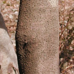 幹は明るい褐色で表面に無数の小さな突起がある。大木は無く径は細い。この写真の木も直径12センチ位。小さな突起は黒文字などと共通している。