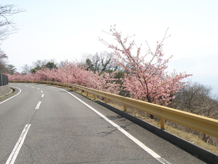 三月の中旬には笛吹峠に植えられた河津桜 が咲く 海の青さがあればなお奇麗だが この日は中国からの黄砂が飛んできていて海は白くかすんでいた |