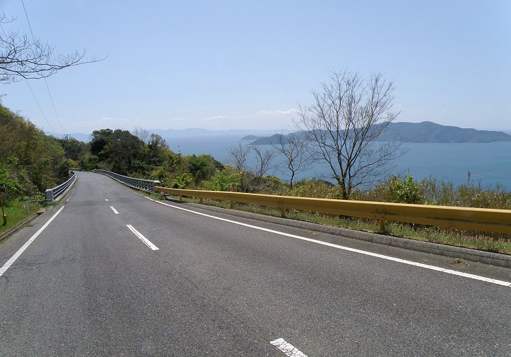 4月の晴れた日の笛吹峠 海は青い もう山の緑は濃い この道はオレンジロードである 左の奥が四国で霞んで見える 右の島は平郡島で、その右には九州の国東半島がある |
