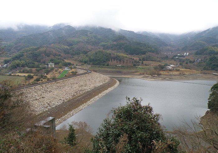島では貴重な貯水湖である 正面の左側の山が喜能山だが霧で見えない 周りは棚田が多くて民家も風情がある 道を右に登ると笛吹峠である ダムの西側から写す 笛吹峠は南から西の景観が良い 四国や国東半島が見える(雲や霧がない時) 下は春の時 |