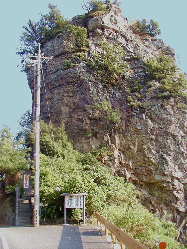 その岩は南に海水浴場がある海そばに、波に侵食させた残骸のようにそそり立っている。 台風を避けるように北側の岩下に馬頭観音がある。 海水浴場は夏は波静かで水や砂も美しい。 場所は橘町中心部より海岸沿いに東に行ったところ