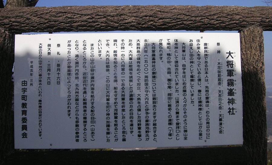 創建由来 昔大内氏により八将軍の一である大将軍を祀ったものと言われる 1、大将軍とは陰陽道でまつる八将神の一。太白星の精で、地に降り四方をつかさどるといわれる。 2、大将軍とはインドのアタバク元帥、日本では大元帥(だいげんすい)明王と呼ばれて国家鎮護の大請願をもっている。 西側を通る峠の道路より徒歩5分 由宇町より参道がある 由宇町の説明版