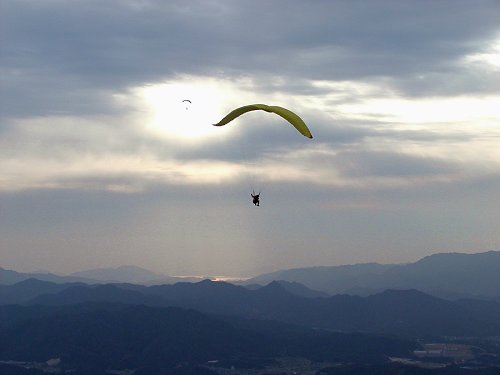 ハンググライダーの飛翔 この山の西頂上に飛行基地がある。 一機ははるか遠方の彼方に見える。 遠くに瀬戸内海が光る。 上昇気流に乗り舞い上がって行く。 姿勢は一定しているように見えるが 色々と動いて操作している。 写真を写していると回ってくれた。 |