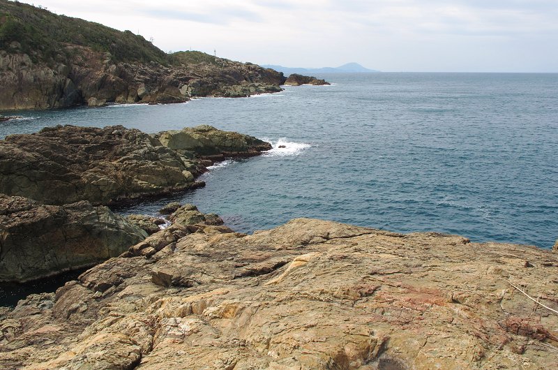 付近の岩は赤茶色をしていて普通の黒い岩とは違う。この中を黒い岩が蛇のように伸びているのだ