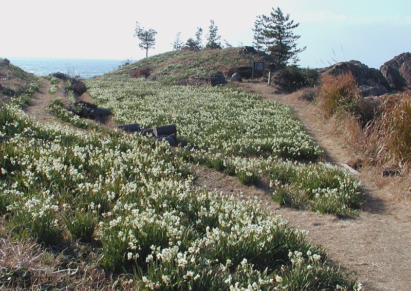 蛇岩の手前の海岸には房咲きの日本水仙の大群落があり、寒い一月に開花する