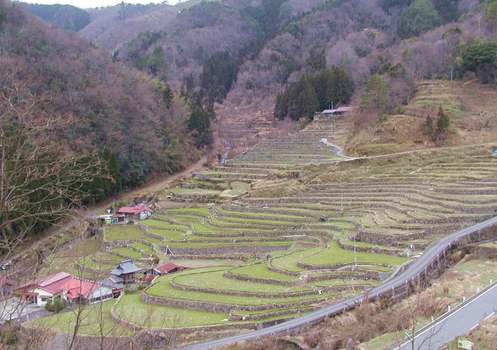 | 島根県吉賀町柿木村 大井谷棚田 関連で井仁の棚田 広島県安芸大田町(筒賀村) 高知県棚田を見る 高知県棚田b 佐賀県の九十九島付近の棚田 長門海岸の棚田 中国縦貫道の六日市インターを降りて187号を益田市(北)に向かい、柿木村の中心部を過ぎて少しで途中に大井谷の看板があり、左折して川沿いに登るとまもなく棚田が見えてくる。 ここは全部で800枚以上田があるらしい。写真に写っていない右の道路より上を合わせてだが。 地形に沿い天然石の石垣が見事にカーブを描いており、先祖の農業に対する意欲が伝わる。 位置図を見る グーグルマップ位置図 |