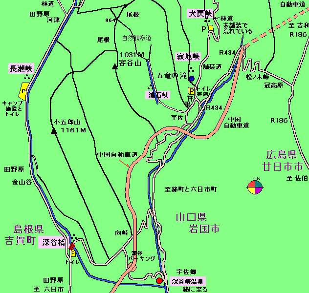 | 秘境と清流の長瀬峡 (深谷川) 島根県 吉賀町 中国自動車道を広島県境(中国自動車道の最高地点で約720M) から西に向かい、冠山下の長いトンネルを抜けて島根県に入ると、 大きな橋がいくつも出て雄大な景色となる。 このあたりが3県の境界になっている。 そこには深谷川という高い山をえぐり取って流れている川がある。 その深谷川を県道が渡る場所に深谷大橋がある。 川は眼下はるか下に流れている。 河床まで降りる歩道があるが降りる気にはなかなかならない。 その川を上流に上って行くと道は曲がり崖はせまるし、 おまけに地蔵さんもカーブには祭ってある。 |
