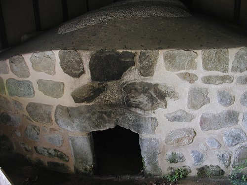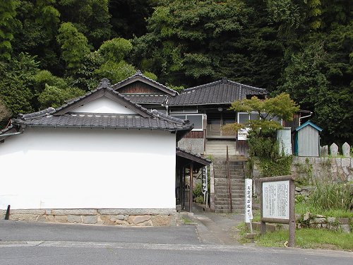 山ぎわにあり奥のお寺で手前の白い壁の建物が石風呂