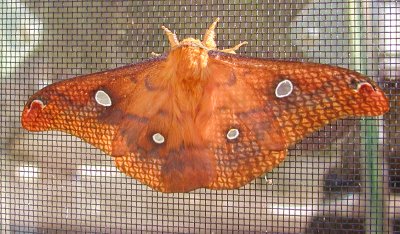 前翅長46mm キハダを食べる ほぼ実物大 9〜10月 体全体に毛が多い 羽にそれぞれ一つづづ窓が空いており半透明 前翅の先にもブーメラン形の模様あり 斜めの黒い交差は網戸がすけて見えるため キハダは黄色い色があるのでこの蛾の色が黄色? 新画像 10月30日 蝶の部屋に戻る